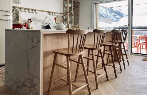 110 m2. More information by the provider: Designed by award winning British architect and designer, Claire Hart, Sonnenhof-Juliet is an apartment that sleeps 4+2 in the centre of the idyllic mountain village of Saas-Fee. Car free, with ski to locker set up this apartment ticks all the boxes, family friendly, level access, luxury high-end interior with eco friendly design.