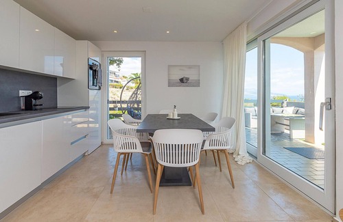 The timeless furnishings create a cosy atmosphere. The bright kitchen offers you everything you need to cook delicious meals. Enjoy the special feature of this flat, the spacious terrace with panoramic sea views. Here you can enjoy your morning coffee and sunbathe on a lounger during the day or prepare your favourite dishes on the barbecue in the evening.