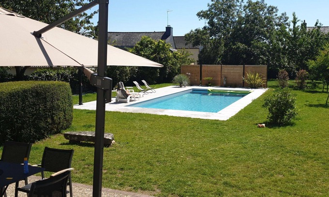 The beautiful manor house "La Maison des Frères" offers a tranquil and luxurious vacation rental experience. This property boasts a main house and an outbuilding situated just 100 meters from the charming center of Caden, France. Surrounded by a spacious 1,500 square meter fenced area, you can enjoy a well-maintained lawn, a delightful wildlife garden, and a stunning garden perfect for relaxation. The property features a heated swimming pool (11 x 5 meters, depth 50 - 160 cm, available seasonally from May 12 to October 13) with a shutter cover, ensuring your privacy and comfort. Amenities include an outdoor shower, a boules court, a storage room for bicycles, and on-premises parking, ensuring a convenient and hassle-free stay.