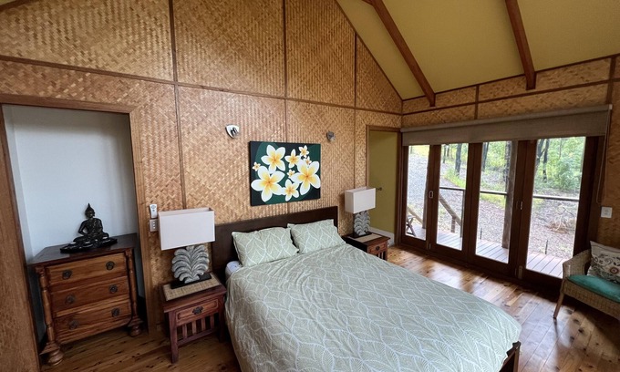 SET ON 25 ACRES AND WITH NO IMMEDIATE NEIGHBOURS OR ROAD FRONTAGES, "BALI VIEW" IS ONE OF ONLY A SELECT FEW HOLIDAY RENTAL PROPERTIES IN THE PACIFIC PALMS AREA THAT OFFER ACCOMMODATION OF SUCH A HIGH STANDARD WITHIN A COMPLETELY PRIVATE ENVIRONMENT.