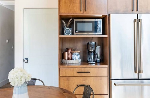 Our family friendly home features an open concept living area and kitchen, the living room doors open up to the front patio, perfect for hosting an intimate group. This newly built home has vaulted ceilings in the kitchen and living area