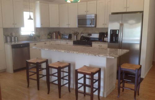 Beautiful Three bedroom, two bath, two deck, large kitchen home! Central heat and air-Conditioning short walking distance to Pristine beach and gorgeous bay, restaurants, bars, shops, museums, parks, pier and lighthouse. Washer, dryer, dishwasher, microwave, large gas grill, outside shower, cable tv, three new flat screen tv's, pillows and blankets, plenty of off street parking, high speed internet, 5 ceiling fans, 2 large decks, with new deck furniture, coffee pot, pots, pans,silverware, dishware, and toaster. Smoke free house. Includes 5 Adult beach badges, 5 beach chairs and a beach umbrella. Enjoy yourself!