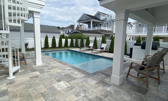Beautiful 6-bedroom 6.5 6.5-bedroom beach house with a year-round heated pool. Great for a quick escape or a beach party for friends and family on the most desirable beach in Stone Harbor. Only a few steps from the sand