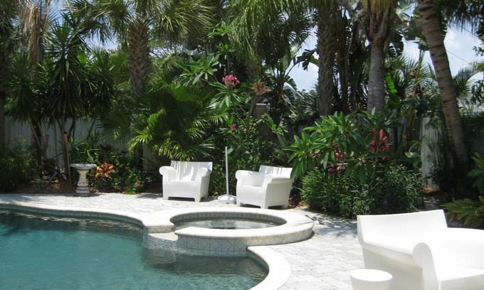 Relax poolside under the palms and banana trees in this spacious recently re-constructed 2000+ square foot first-floor suite. The center-piece of the home is an expansive pool-side ultra-private garden with a heated pool and spa, sun-beds and barbeque. Located just minutes away from the Gulf of Mexico and its white sandy beaches, as well as award winning Fort DeSoto Park and historic Pass-a-Grille. Belle Banane is a great retreat and a serene haven for mature adults and their furry friends.