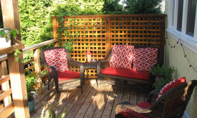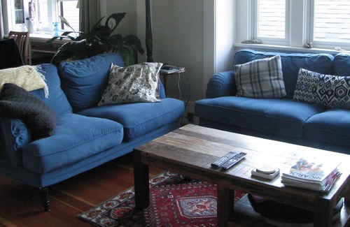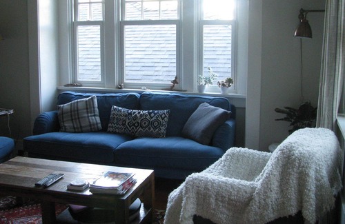 The main entrance opens on a very bright double living/dining room with 2 sofas, library, flat screen TV with Netflix, cable and music system. The living area will welcome easily 6 people around an antic pedestal table. Its 3 big bay windows offers a lovely sunny area for relaxing. There is an open concept from the living/dining room to the kitchen area with huge counters space, stainless appliances and nook area for breakfast. The kitchen leads to the 2 big patio/decks, to enjoy a nice diner outside and relaxing with coffee or wine and a good book. The patios are south exposure over looking our backyard with the biggest Hemlock tree of the neighbourhood. Enjoy the birds songs in the heart of the city.
