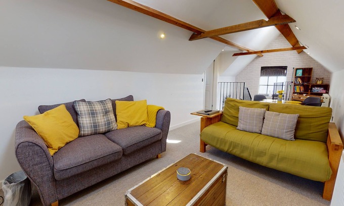 The living area has two 2 seater sofa's a dining table for 4, books and games.
