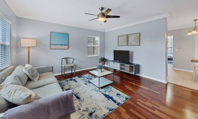 It is the perfect base for both leisure and business travelers looking for a cozy place to stay in Tampa. Our apartment is situated in a multi-family building complex, featuring spacious living areas with a relaxing ambiance. The living room features a comfortable sofa covered in soft throws and a smart TV with streaming services. You'll find a small dining area for your meals near the kitchen.