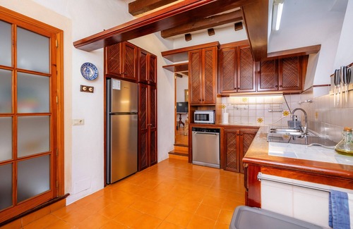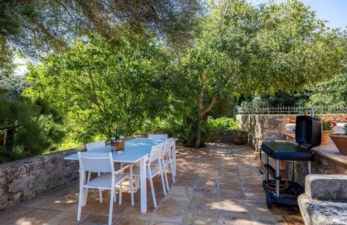 Only a few kilometres from Artà, on a 200.000 m² large plot, which includes fields and a tree population, lies the Finca Hort den Salat. Far away from the hustle and bustle of the tourist hotspots and yet with ideal traffic connections, this accommodation is perfect for anyone who wants to spend a relaxing holiday in harmony with nature and a maximum level of privacy. On 600 m² living space and 2 floors the Majorcan country house offers 2 living rooms with characteristic ceiling beams, a very well-equipped kitchen, 3 dining rooms, 4 bedrooms (one with a queen size bed and 3 with 2 single beds) as well as 5 bathrooms (of which 3 en suite). It can therefore accommodate 8 people. Amenities also include Wi-Fi, fans, air conditioning in the main rooms, a fireplace, a wood burning stove, satellite TV, board games, children's books, a baby cot, a children's bed and a high chair. The absolute highlight of the accommodation is the fantastic outdoor area. Whether in the 55 m² pool, on one of the roofed, furnished terraces or on the spacious patios and terraces - relaxation is guaranteed! Let yourself be enchanted by the bright bougainvillea, prepare delicious dishes on the grill and forget the worries of everyday life. Numerous loving details such as a fountain, a pond or seating arrangements in antique design complete the charm of this breathtaking finca. In the village of Artà, 3 km or 6 minutes by car from the accommodation, you will find shops, restaurants, bars and cafés. The sandy beach of Platja de Canyamel is 12 km away or a 17-minute drive and the beaches of Sa Marjal and Cala Bona are about 12 km away. Listen to the sound of the waves and let your eyes wander over the turquoise blue sea - here holiday dreams come true!