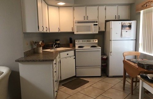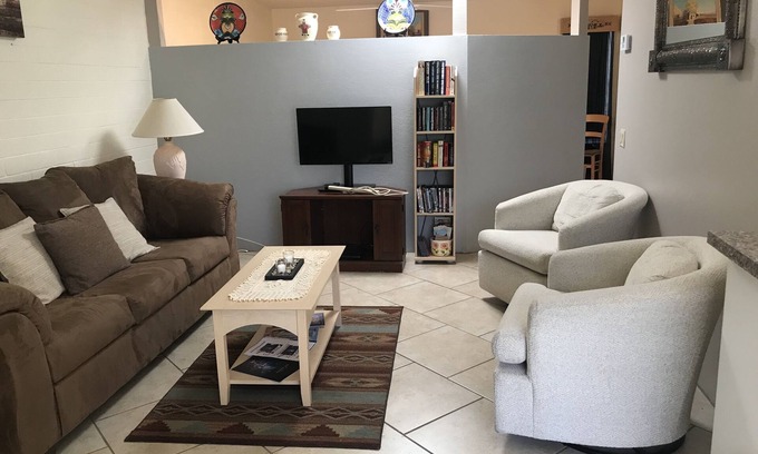Beautifully furnished casita. One bedroom, one bath with a new sofa sleeper. 588 sq. feet. Adult community , one guest staying must be 55. The community offers a pool and jacuzzi very short distance from casita. Beautiful courtyard outside front door. Within walking distance to groceries, restaurants and shopping. The unit comes with all utilities, cable and Wifi, a beautiful kitchen where you can enjoy preparing your own meals. You can enjoy hiking in nearby Madera Canyon, or golfing on one of the many golf courses. Take a trip to Tombstone or Kartchner Caverns.