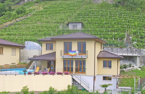House for private use. Cugnasco lies ca. 11 km from Locarno at the suns cliff. The beautiful family house, built in 2001, has Swimmingpool (ca. 20 m2, open from middle May until ca. end of September, weather dependent). Quietly and very sunny position with panorama view on the Magadino plain, the mountains and the lake. Open and covered seating area with garden furniture. Balcony. Driveway until house. 3 private parkings. Bus stop, shop ca. 1.5 km. Railway station ca. 3.5 km. Lake ca. 7.5 km. Washing machine for private use. Bed, kitchen linen and baby cot available. Pets permitted.