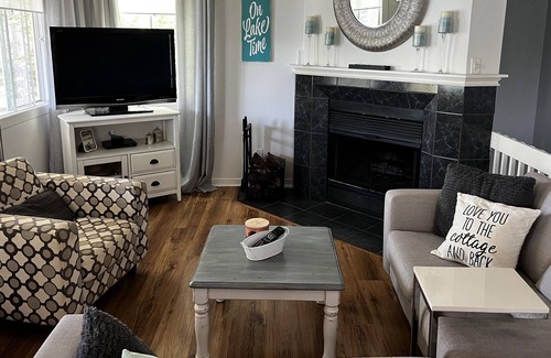 The oversized front yard is perfect for friendly lawn games. We have many available to our guests. Near the waterfront is a fire pit with Muskoka chairs and firewood (within reason) is included. There are also swings (baby swing available), a cute playhouse, and a ropes course.