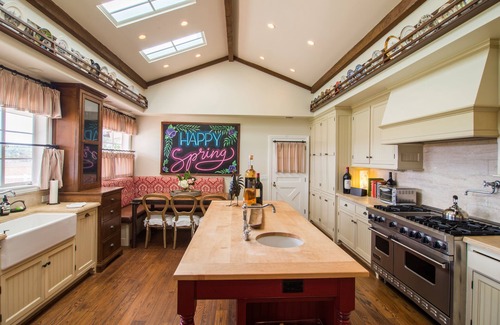 Beautiful ranch style house with lots of charm! Gated property in peaceful community with easy access to the freeway, beaches and nearby stores and restaurants. The main house features a large master bedroom with adjoining bathroom suite and a second bedroom with on suite bathroom. Beautiful large open space kitchen with modern appliances and large living space area perfect for entertaining. The other three bedrooms are situated in adjoining houses with on suite bathrooms. The property also features a large heated pool and lounge chairs, a spa jacuzzi that fits 8-10 people, an outdoor fire pit, and a barn that opens up toward the pool equipped with a wet bar, pool table and dart board. The outdoor patio has a large dining table and a bbq. The main house and outdoor area are equipped with a Sonos speaker system, and there is wifi and cable available as well.