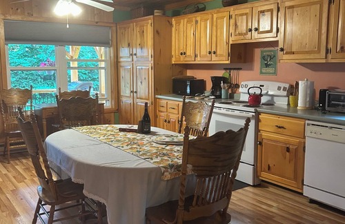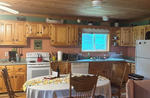 The property is turn key. Just bring some food…and all the rest is there waiting for you - including the bar-b-q! You have delicious and clean well water at your disposal. Newly built, an amazing porch awaits you. The porch is huge with a sitting area and outdoor dining. A spacious kitchen, large sitting room, and two bedrooms - one with an ensuite bathroom. There is also a 2nd full bathroom as well. Appliances include modern fridge, stove, microwave, toaster oven, coffee makers, washing machine and dryer. The property is located on 3 beautiful acres! You can easily sleep 4 on the two queen beds. For an additional cost there’s a futon in the living room to sleep two more people.