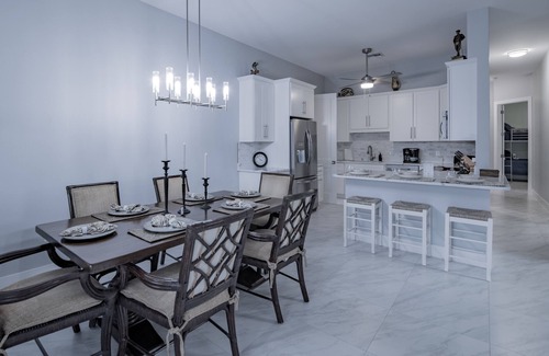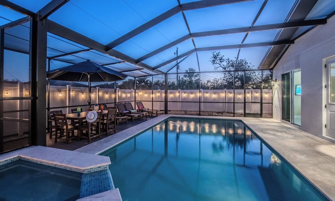 Create memories of a lifetime enjoying the Florida sunshine by this stunning enclosed private pool with a hot tub and waterfall feature. Soak up the sun in one of the lounge chairs and enjoy the beautiful landscape. There is also an enclosed dining space built off the back of the pool space so you can truly spend all day and night spending time together outside.