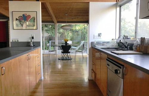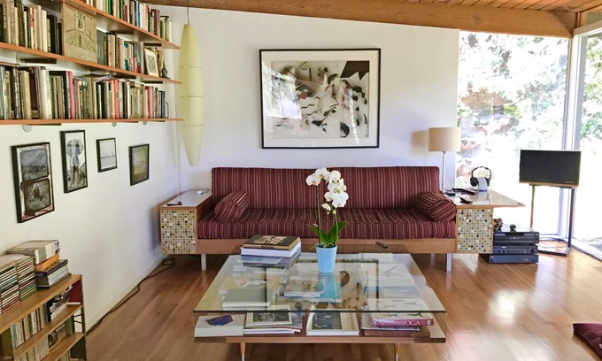 This is a gorgeous 1br, 1.5 bath Mid-Century style home, completely furnished and perched under the Hollywood Sign in Beachwood Canyon. It features an open living, kitchen, and dining area with floor to ceiling glass walls and doors that open to a lovely patio deck and lush garden. Set back from the street off a private gated entry and fully furnished with washer/dryer, fireplace, wi-fi, etc. This secluded hideaway is the ideal vacation escape minutes to Hollywood, restaurants, museums and attractions.