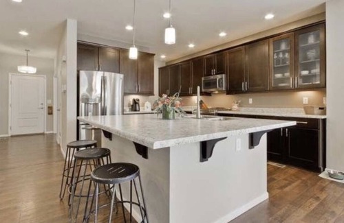 1st Floor : Has a bedroom with a Sealy pillowtop Queen bed, a full bathroom, formal dining room, Open concept Living room with High Vaulted ceilings and Kitchen. There is huge island with Hi-Def countertops, bar seating, stainless steel appliances such as fridge, dishwasher and Gas stove. The house has a huge Concrete Stamped Patio with patio furniture, and a 5 person HOT TUB!