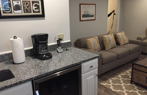 Fully equipped modern kitchen with granite countertops, cooking island & 4 bar stools