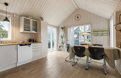 This holiday home is the ideal choice if you are looking for a peaceful holiday in a beautiful natural setting with all modern conveniences. In your charming holiday home in a unique location and just a short walk from the beautiful Limfjord, you can enjoy the fantastic view of a beautiful natural area with fjord, forest, meadows and a small lake. The holiday home is situated on a large natural plot at the end of a secluded gravel road, which guarantees peace and privacy. You can also look forward to the activity room in your holiday home, where you can play table tennis, darts and table football.