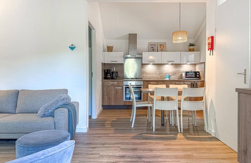 Be welcomed by the bright and tasteful furnishings. Relax on the cosy sofa, watch TV or read a book in the peaceful atmosphere of the living area. Take advantage of the open-plan design of the room, which creates a friendly ambience. Prepare your favourite dishes in the well-equipped eat-in kitchen and enjoy meals together at the large dining table.