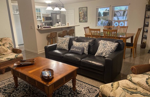 Granite and marble abound in this renovated Hawaiian style home. The Master bedroom "The Palm room" has a king bed, walk-in closet and recently updated private full bath and private access to the Lanai and garden through the french doors. The second bedroom "The Seashell room" has a queen bed with large closet and opens up to the outdoor Lanai and the gardens thru a large sliding glass door. The third bedroom "The Ocean room" has a queen bed and a large closet, plus toy for all ages and an adventure of ocean animal stuffed toys.