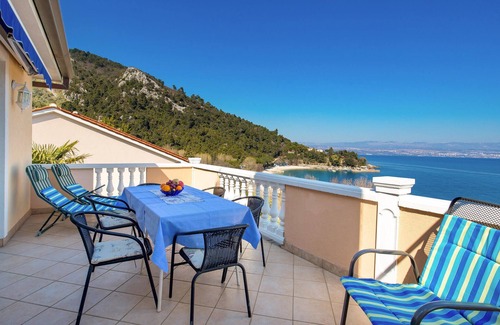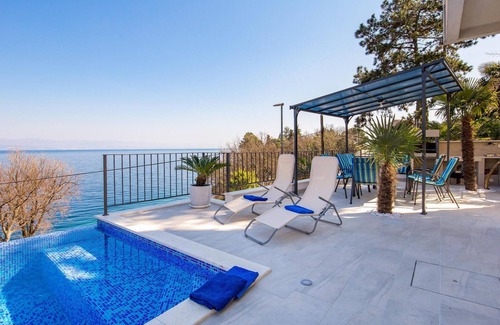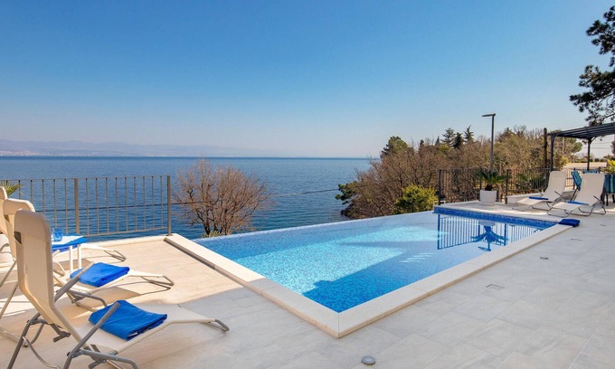 The comfortable and spacious house is well located opposite Medveja beach, one of the most beautiful beaches in Kvarner. Look forward to cosy rooms with homely, modern furnishings and maritime charm. Relax here in a pleasant setting, enjoy meals together at the long dining table with a fantastic sea view and make yourself comfortable on the sofa in the evening after an eventful day.