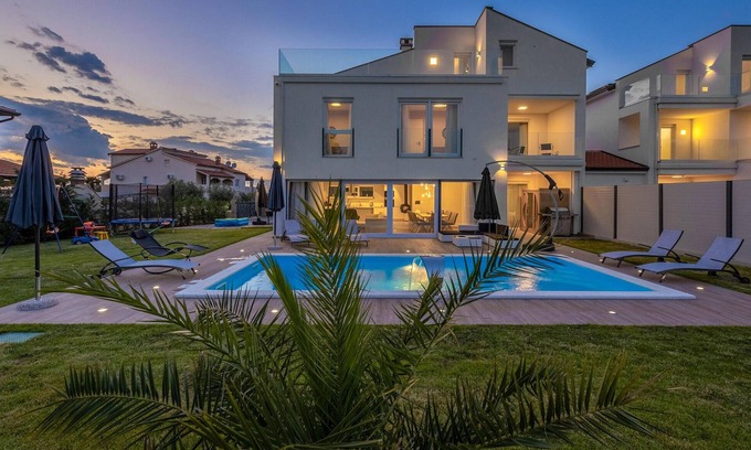 On the ground floor of the villa there is a beautiful modern kitchen equipped with everything you may need during your stay and a living room for hanging out with your family and friends. From the stylishly decorated living room, large sliding glass doors open the interior to a beautiful courtyard of 800 m2, decorated in detail with Mediterranean plants. There is also a 26.5 m2 swimming pool in the yard with the possibility of heating, massage pumps and a waterfall, and there are also nine deckchairs available for you to enjoy sunbathing. In your free time, this villa offers you a whole range of entertainment: jacuzzi, sauna, fitness equipment, swing, toys for children, there will surely be something for everyone. The villa is fully air-conditioned and covered with Wi-Fi internet for carefree internet surfing from all rooms. There are four private parking spaces next to the villa itself.