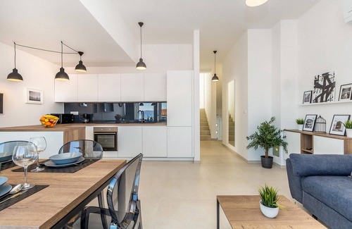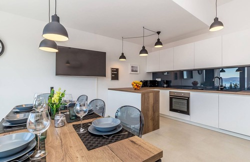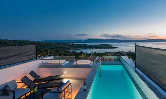 In Njivice, a beautiful place on the island of Krk, you will find this stylishly furnished semi-detached house. The house is located in a terraced area on a slope, from which you have a beautiful panoramic view of the blue sea. The house includes the first floor and the second floor and a beautiful roof terrace with sundeck and pool. The entrance to the house is located at the back of the building, where there are two parking spaces. The garden is fenced and is located on the same level as the first floor, where there is a bedroom and a toilet. In the garden there is a barbecue with space for outdoor meals. Upstairs there is a spacious living room with kitchen and two bedrooms with bathroom. On the roof terrace you will find a poolside lounge area and a deck with sun loungers. All indoor and outdoor details and equipment have been carefully designed to make your stay in serenity and relaxation. On the island of Krk, lovers of active vacations can expect a pleasant and fulfilling vacation. There are promenades, miles of cycling paths and jogging trails that lead through the beautiful landscape and are an ideal way to discover the amazing natural beauty. Njivice is a place with the best restaurants in Krk. Taste the flavors of traditional island specialties and visit the nearby wineries.
