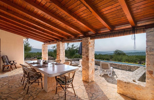 Nestled in an enchanting natural landscape, this sunny holiday home offers you a peaceful retreat with privacy and a wonderful panoramic view. Conjure up delicious Mediterranean dishes in the bright kitchen and take a seat at the stylish dining table. Light the fire on cooler days and enjoy relaxing evenings with Croatian wine and stimulating conversation.