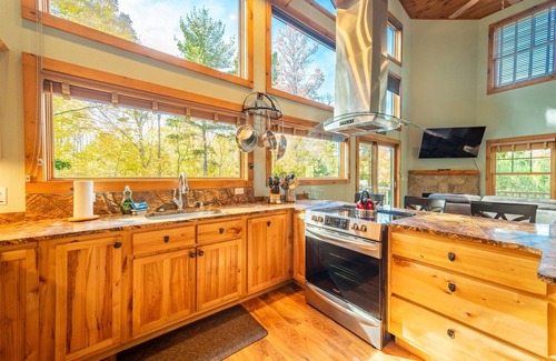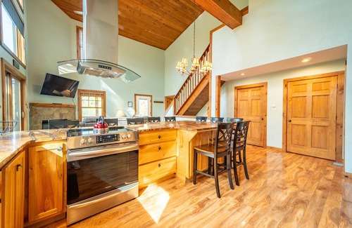 Gather in the open-concept living area around the cozy gas fireplace or cook up memorable meals in the fully equipped kitchen with granite countertops and sleek appliances. Outside, a large deck offers dining with mountain views, a 5-person hot tub, Adirondack seating, and a fire pit for stargazing and s’mores.