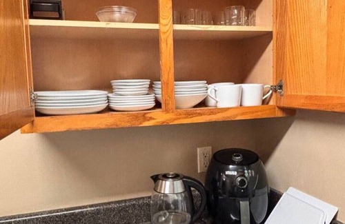 The downstairs living area is perfect for relaxation with plush seating and a large streaming TV, ideal for movie nights or game days. The round dining table makes a great spot for family meals or puzzle afternoons. The fully equipped kitchen features a Keurig-style coffee maker, air fryer, oven, microwave, electric teapot, blender, and all the essentials you need to cook up a storm.