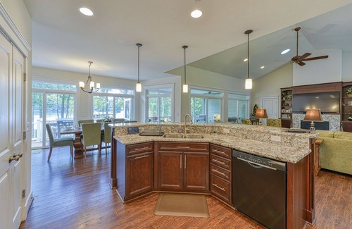 Open-concept kitchen with granite countertops, island seating for 6, and adjacent dining room with seating for 12.