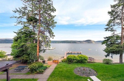 Carved into the side of the mountain 20 minutes away from the beautiful city of Kelowna, this chic style condo is beach front on world renowned Okanagan Lake! Take in the gorgeous sunrise over the water while sipping your morning coffee from the living area or deck.