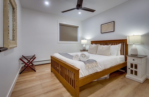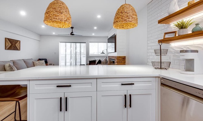 The living room has a 60" Smart TV (that allows you to login to all your streaming services), an electric fireplace and direct access to a private patio where guests can enjoy a BBQ and view of the lake.
