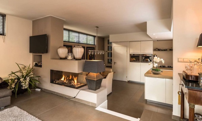You will find in the second part of the this space a large living room with a large spacious sofa and luxury easy chair with canal view. This large Houseboat features a flat screen TV and free Wi-Fi.