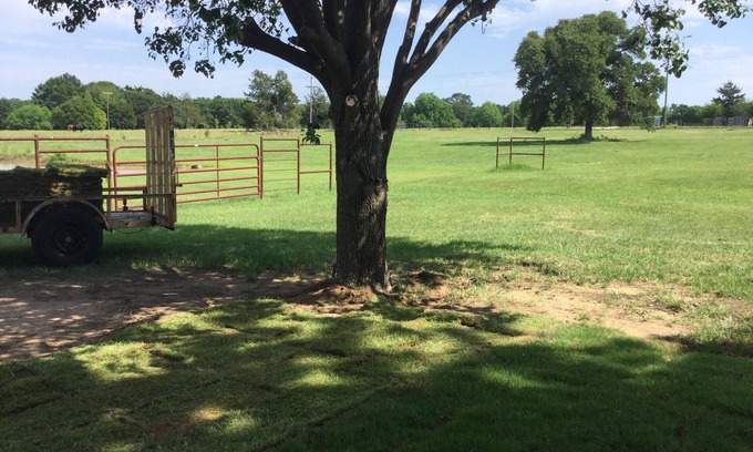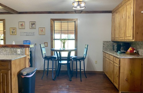 Log cabin on almost 8 acres with room to stroll leisurely within the wrap around porches or within the acreage. Choose your favorite view of wide open fields,pond or copse of trees. Be it the clear blue sky with rolling cumulus clouds during the day or a canvas of stars on a dark blanket of pure night against the moons soft presence, you choose your favorite moment in time. Or perhaps the sunrise or the sunset will lull your senses with calm. Come and enjoy our cabin for peace and quiet and/or a quick trip to nearby 4 lakes(Lake Texoma is closest), 2 casinos or shopping/restaurants in Sherman. Message me for more details on these.