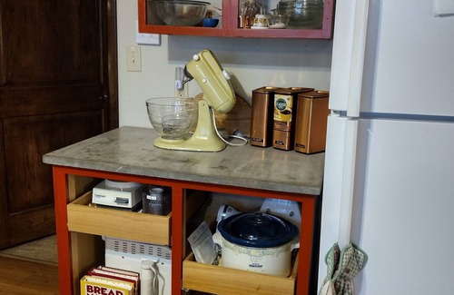 This kitchen was designed to assist individuals with disabilities to accomplish food prep tasks. The kitchen has a center with bread machine, food processor, crock pot, rice cooker, and mixer easily accessed by those with physical limitations.
