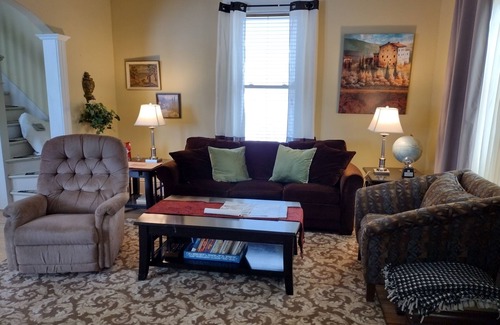 The charming living room is small but seats 4 to 5 people comfortably - TV and DVR so bring your favorites or take your chances with Gramma's collection.