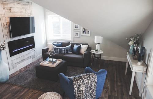 The inside is beautifully decorated in casual modern flair. From Quartz countertops to stainless appliances, walk in shower, luxurious linens, electric fireplace and 50” TV, you will find everything you need to make your stay comfortable and complete.