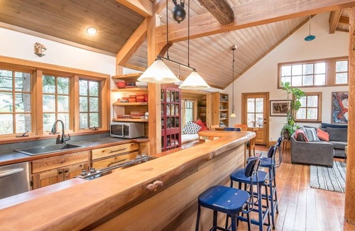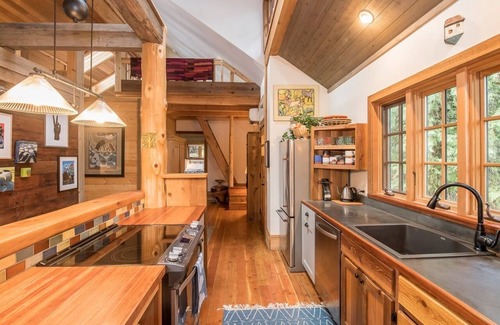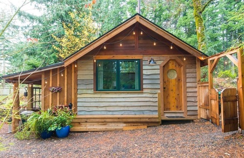 The cabin has it all. Luxury linens, bright skylights, beautiful backyard and deck, gourmet kitchen and standalone guesthouse.
