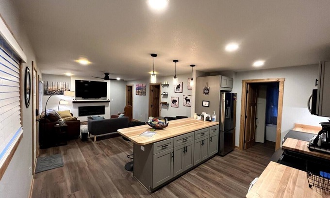 An open kitchen with island seating overlooks the cozy living room with a huge TV and electric fireplace. The queen bedroom has extra storage in drawers under the bed. The second bedroom features a bunk bed with a twin on top, full on the bottom, and a twin trundle pull-out. There is also a sofa couch in the living room!