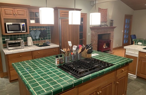 Accommodations: 5 bedrooms, 3.5 bathrooms, living room, dining room, gourmet kitchen, media room (lite), playrooms/yoga room, sauna, hot tub, decks with views, lots of closets, workshop, garages, outbuildings… (Comfortably sleeps 10, can sleep up to 12.)