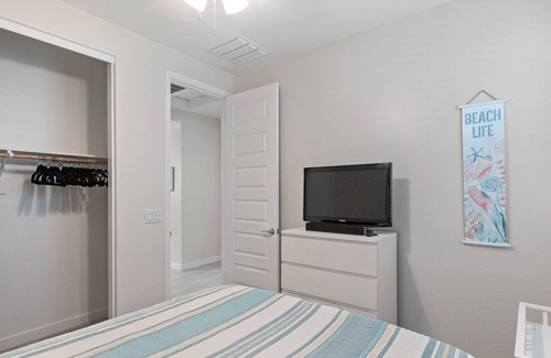 A beautiful new build with open living space, a fully stocked kitchen, and an additional den/TV room. Also available to you are three televisions with access to all of your favorite streaming services, a treadmill and free weights, and a coffee bar. Two bedrooms available with a shared bathroom.