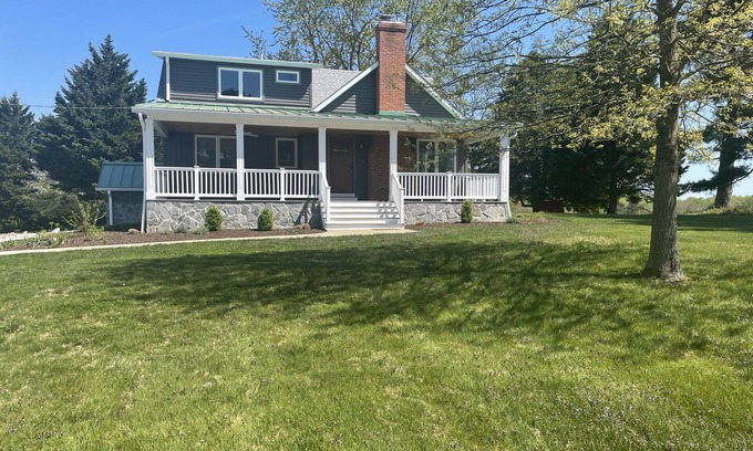 Brand new renovated farmhouse centrally located between Annapolis, Baltimore and DC. Tour the sights and then return home to the peace and quiet of a 3 acre farm with expansive meadow views. Relax on the large front porch or enjoy dinner and drinks on the back deck looking out over the fields. Light-filled kitchen is well stocked for cooking and features brand new appliances, table seating for 6 and 4 barstools. Comfortable living room with large Frame TV and pellet stove insert for cold winter days. Spacious main level bedroom has king bed, tv and separate seating, attached bath features walk-in shower with glass doors. Two bedrooms upstairs include queen bed with sitting chair and tv and another large room with two twin beds and tv. Full bath upstairs has beautiful tiled shower/tub combo. All stocked with sheets, towels and other amenities. Owners live nearby and are ready to help with any and everything needed -- just ask!