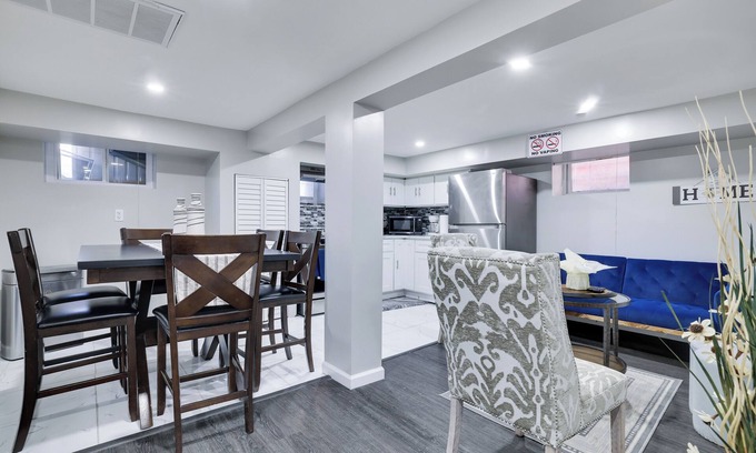 Enter into this open concept ground basement floor unit, with a modern twist that is very inviting. The 4 bedrooms are equipped with queen size memory foam beds. All the rooms are equipped with 55- & 43-inch Smart TV's & living room with 65 inches with ROKU and a desk area to do work on. The bathroom has a very clean look and feel when you enter.