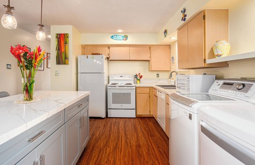 This large, tropical condominium is adorned with Polynesian art and accessories, and new couches. Enjoy cooking with Belgique cookware, breakfast or snacks at the kitchen counter, or sit back in the breakfast nook, and gaze out through the swaying palms at the sparkling ocean. The master bath has a wonderful rain shower .