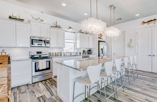 This stilted, three-story home is bright and spacious, with the living spaces on the second and third floors (which are accessed by stairs). There are nautical accents throughout the home, and its open layout makes it great for a larger group of guests. The fully equipped kitchen features a large island with seating, along with upscale accents, stainless steel appliances, and gorgeous granite countertops. The main living area is open, expansive, and full of tasteful furnishings.