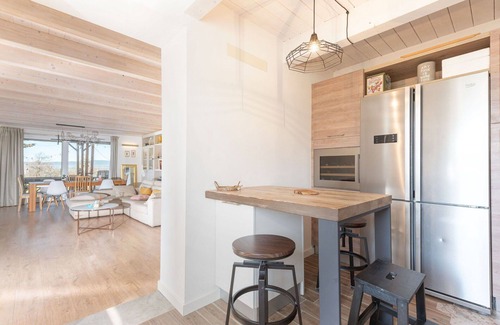 You will be staying in an 8-room house that spans across two levels, covering a total area of 300 square meters. The house features a spacious and bright layout with tasteful furnishings throughout. The ground floor includes an open and large living/dining room with a panoramic window, a dining table, a flat-screen TV, and air conditioning. This level also has one double bedroom with a dressing room, one room with a single bed, and one small room with a single bed. Additionally, there is a kitchen equipped with an oven, a dishwasher, four induction hot plates, a toaster, a kettle, a microwave, and an electric coffee machine. The bathrooms on this floor consist of one shower room with a bidet and toilet, as well as a bathroom with a bathtub, shower, bidet, and toilet.