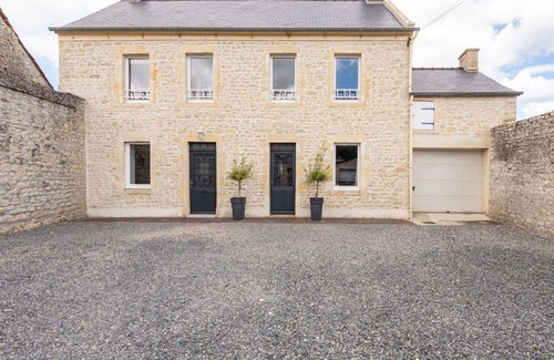 House "Le Repos" is a renovated vacation rental property from 2018, offering a spacious 700 m2 fenced private area with a meadow, orchard, courtyard, and on-premises parking for 2 cars, along with a single garage. It is located in a hamlet 2 km from the center of Commes and 1.6 km from the center of Port-en-bessin-huppain, France.
