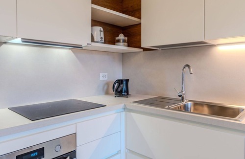 The property is equipped with modern and tasteful furnishings, including a kitchen area with an oven, dishwasher, four induction hot plates, a toaster, an electric coffee machine, and Nespresso capsules (extra charge). Other amenities include a shower/bidet/WC combination, underfloor heating, a patio, terrace furniture, and two deck chairs. Guests can enjoy a beautiful view of the lake and mountains from the property.