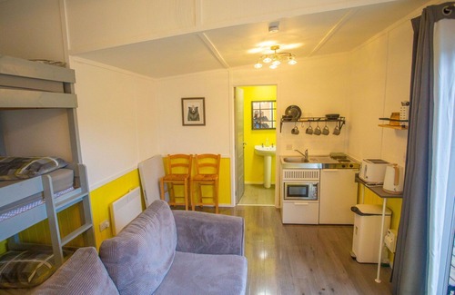 You will be staying in a 1-room chalet called "Dougie's" on the ground floor. The chalet is suitable for a maximum of 2 adults and 3 children. It features an open living/dining room area with modern and comfortable furnishings, including 1 set of 3 bunk beds, 1 double bed, a dining table, and a TV (flat screen). The chalet has a shower/WC (bathroom) and an exit leading to the veranda.